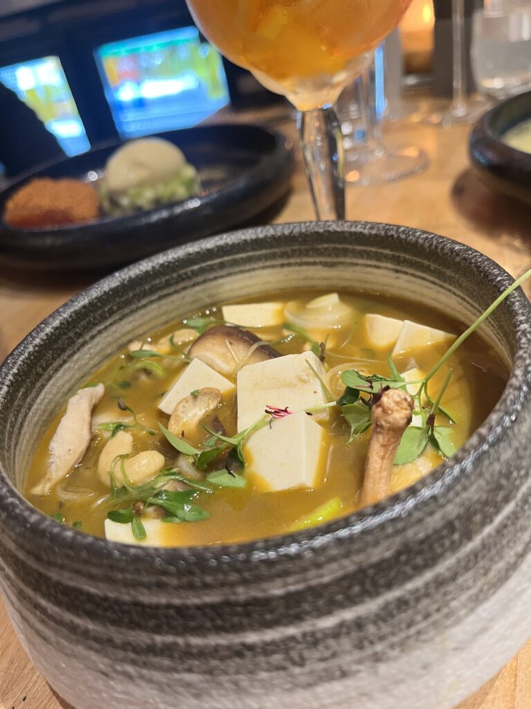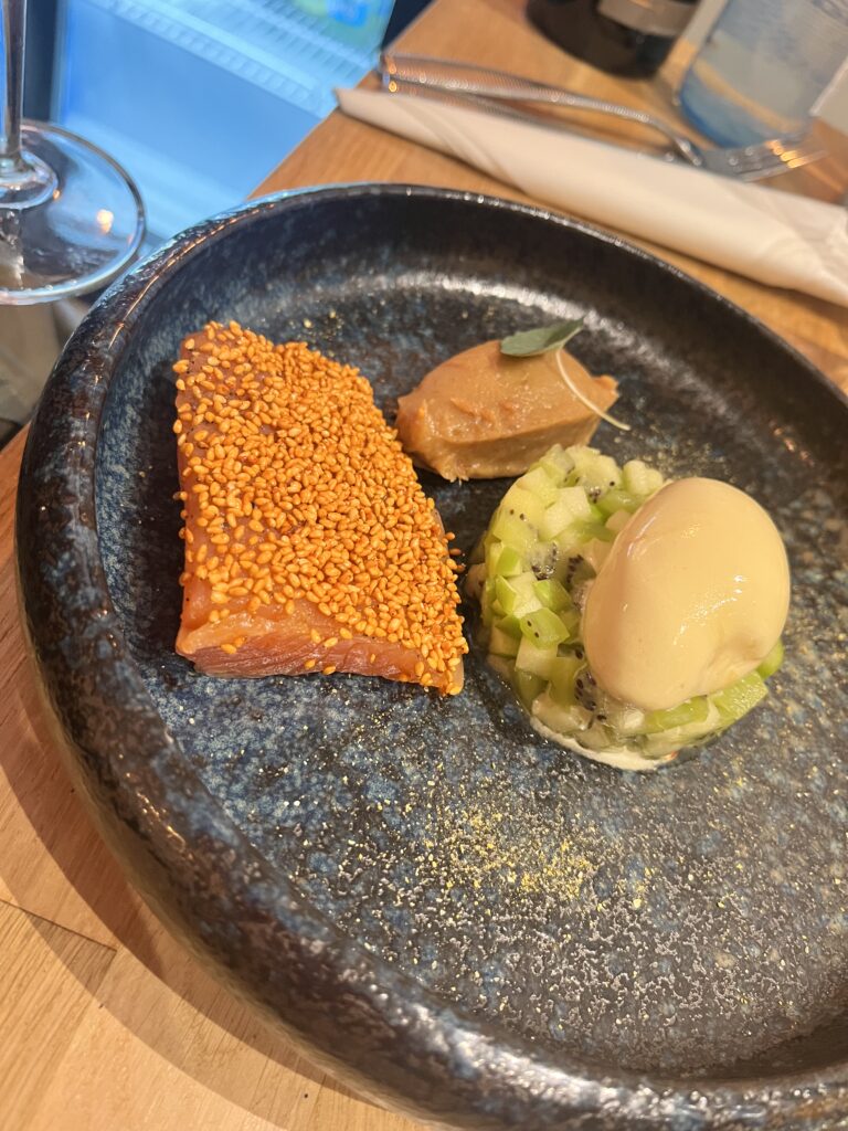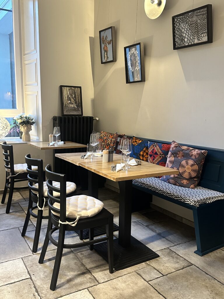 Dès que l’on passe la porte, la décoration subtile avec ses petites touches colorées nous transporte. On vient ici pour découvrir une cuisine fusion audacieuse qui fait voyager nos palais entre la France, l’Afrique et l’Asie. Le chef Seydou manie avec brio des ingrédients comme le bissap, le tamarin, le combawa ou le poivre de Penja pour créer des assaisonnements qui interpellent notre curiosité.