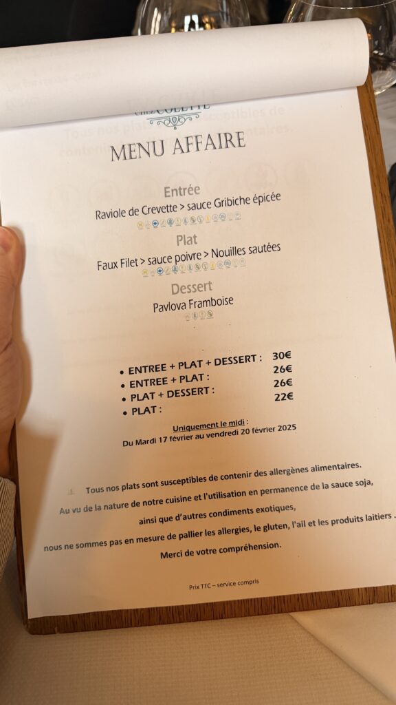 • 💰 Prix : Menu Affaire le midi à 30 €
