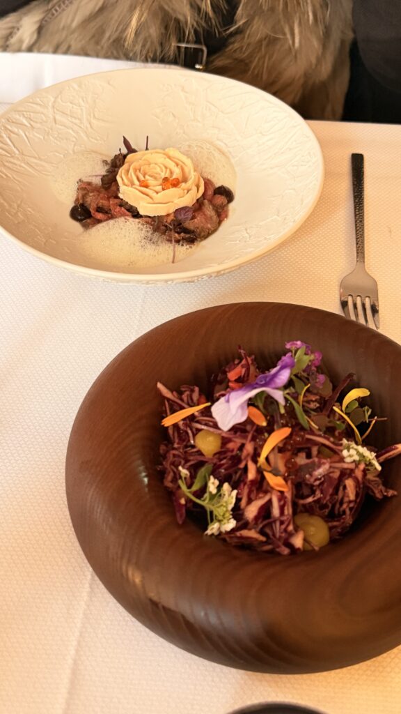 • Les entrées : Tataki de Bœuf au chou rouge et Ponzu / Tempura de Crevettes avec salade de mangue et menthe.