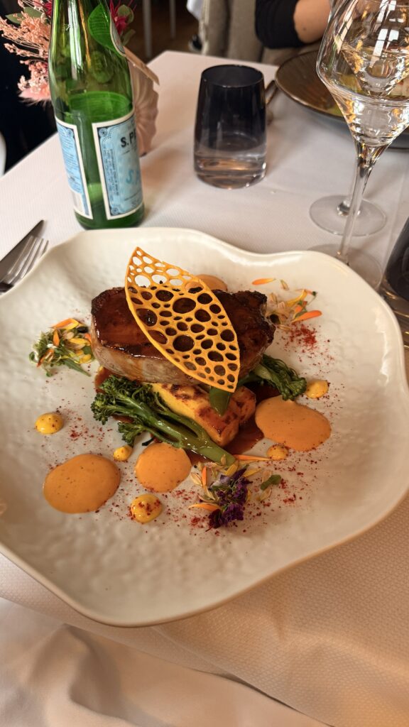 Ce midi-là, la salle affichait complet, signe que les habitués ne s’y trompent pas. La cuisine de Huan est un superbe équilibre. Il prend les bases de la gastronomie française et les réveille avec des touches venues d’ailleurs : un tataki au ponzu, des gambas au curry vert ou encore un veau au satay. C’est fin, c’est élégant et c’est servi dans une vaisselle absolument magnifique qui a fait chavirer mon cœur de gourmande !
