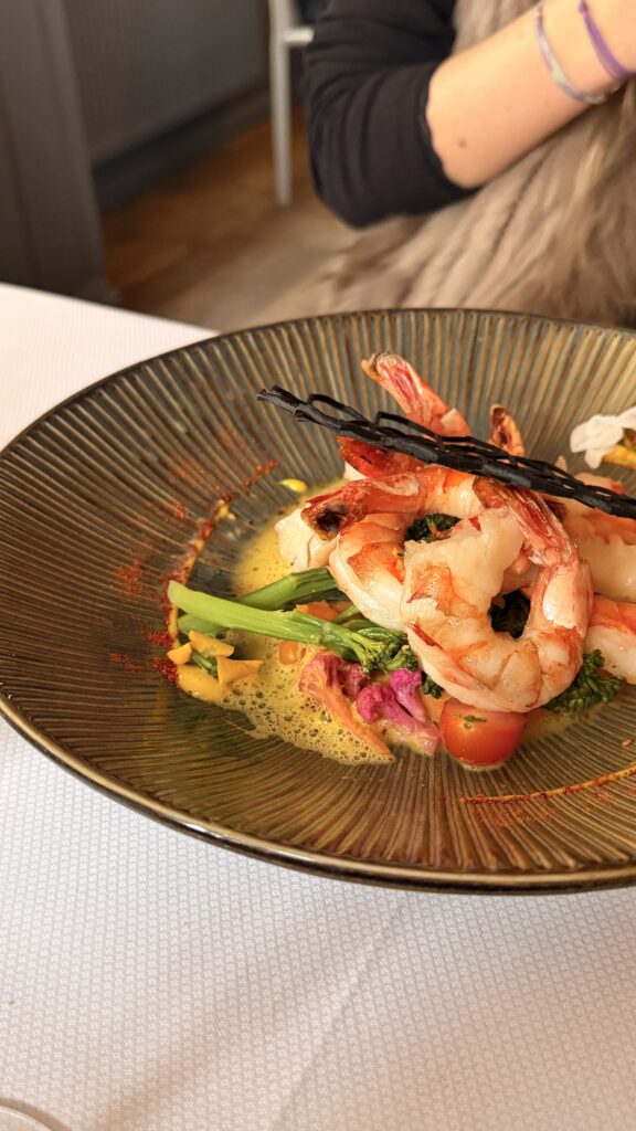 • Les plats : Gambas accompagnées d’une purée de patate douce au curry vert / Veau servi avec une polenta au satay.